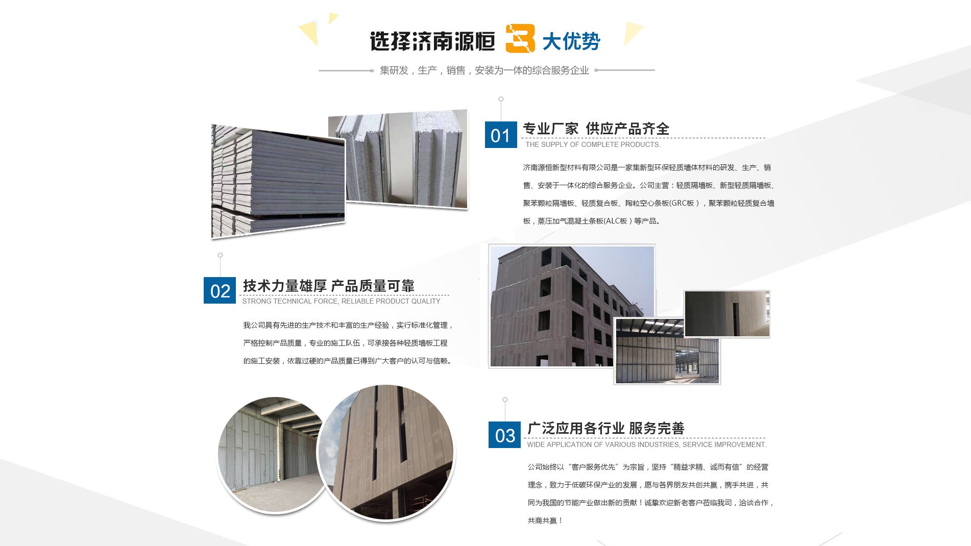 濟南源恒新型材料有限公司坐落于美麗的泉城濟南,是集新型環(huán)保輕質(zhì)墻體材料的研發(fā)、生產(chǎn)、銷售、安裝于一體化的綜合服務(wù)企業(yè)。我公司具有的生產(chǎn)技術(shù)和豐富的生產(chǎn)經(jīng)驗,為您提供輕質(zhì)隔墻板、新型輕質(zhì)隔墻板、聚苯顆粒隔墻板、輕質(zhì)復(fù)合板、陶粒空心條板(GRC板),聚苯顆粒輕質(zhì)復(fù)合墻板,蒸壓加氣混凝土條板(ALC板)等產(chǎn)品,本公司有專的施工隊伍,可承接各種輕質(zhì)墻板工程的施工安裝。輕質(zhì)隔墻板是國家推廣使用的新型輕質(zhì)、綠色無害建材,是墻改節(jié)能政策大力扶持的環(huán)保節(jié)能產(chǎn)品,是發(fā)達國家普遍采用的新型墻體材料。濟南源恒新型材料有限公司實行標準化管理,嚴格控制產(chǎn)品質(zhì)量,依靠過硬的產(chǎn)品質(zhì)量已得到廣大客戶的認可與信賴。公司產(chǎn)品遍布各大城市,與國內(nèi)多家客戶建立了良好的合作關(guān)系。公司始終以“客戶服務(wù)優(yōu)先”為宗旨,堅持“精益求精、誠而有信”的經(jīng)營理念,致力于低碳環(huán)保產(chǎn)業(yè)的發(fā)展,愿與各界朋友共創(chuàng)共贏,攜手共進,共同為我國的節(jié)能產(chǎn)業(yè)做出新的...